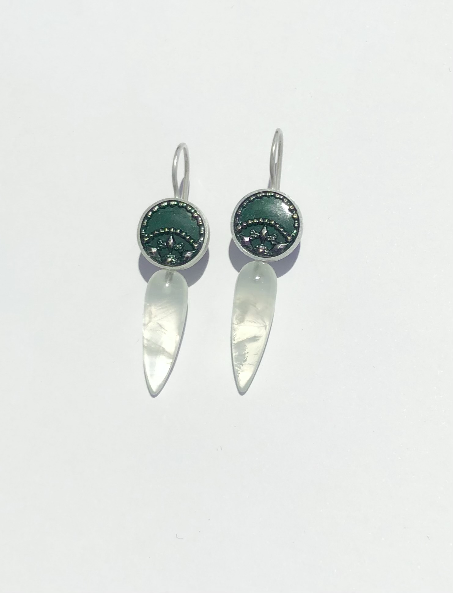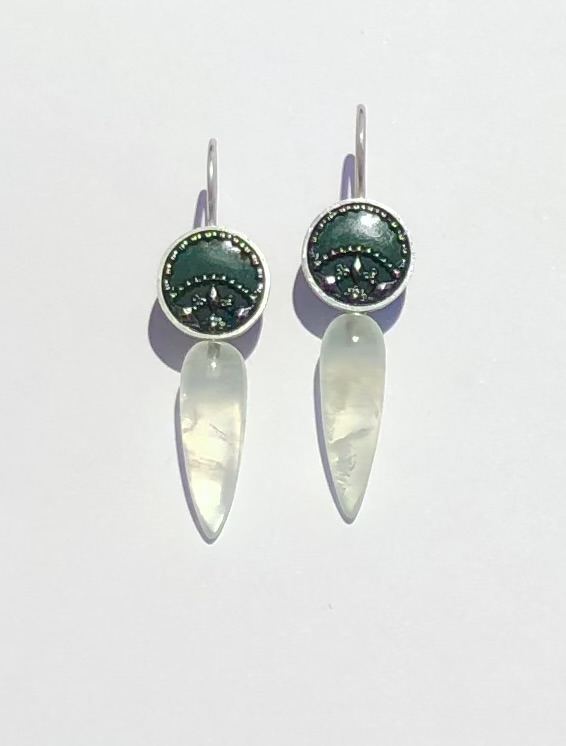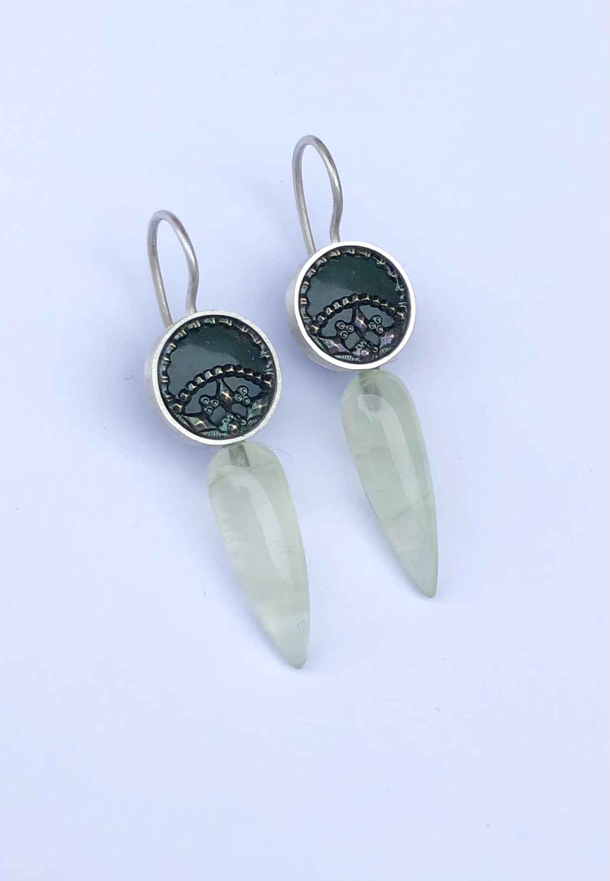 Paar Ohrhänger Silber antike Metallknöpfe, Prehnitpendel