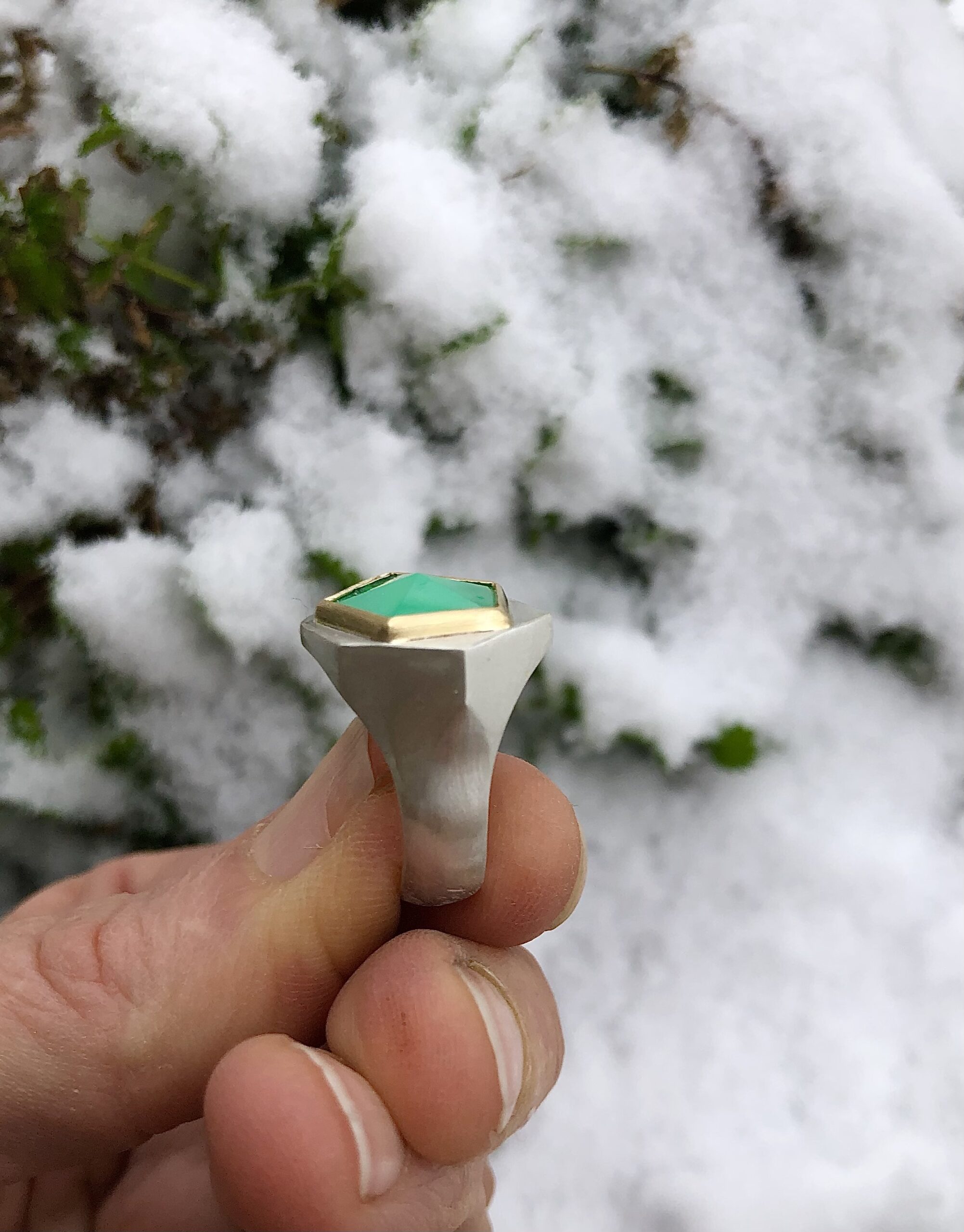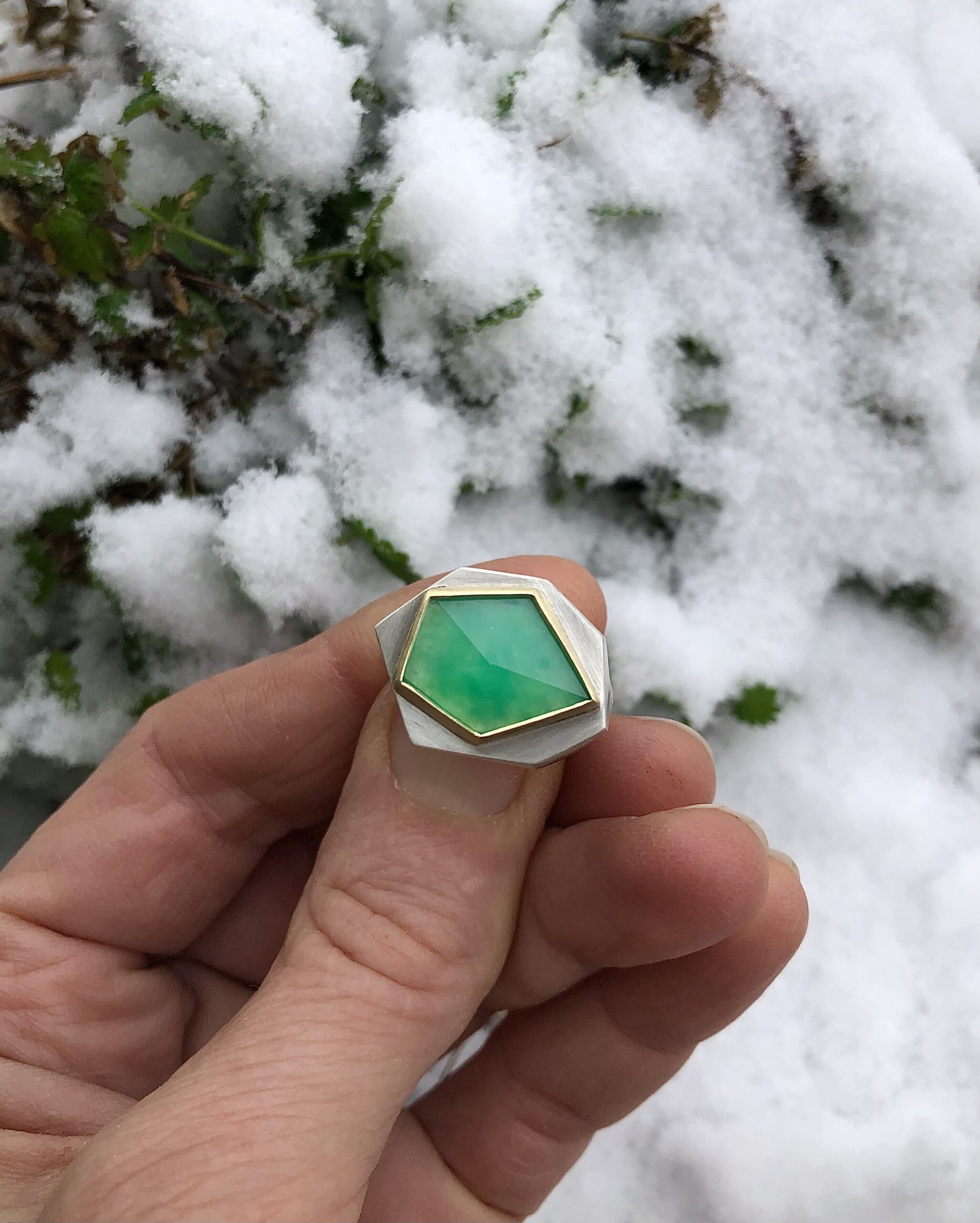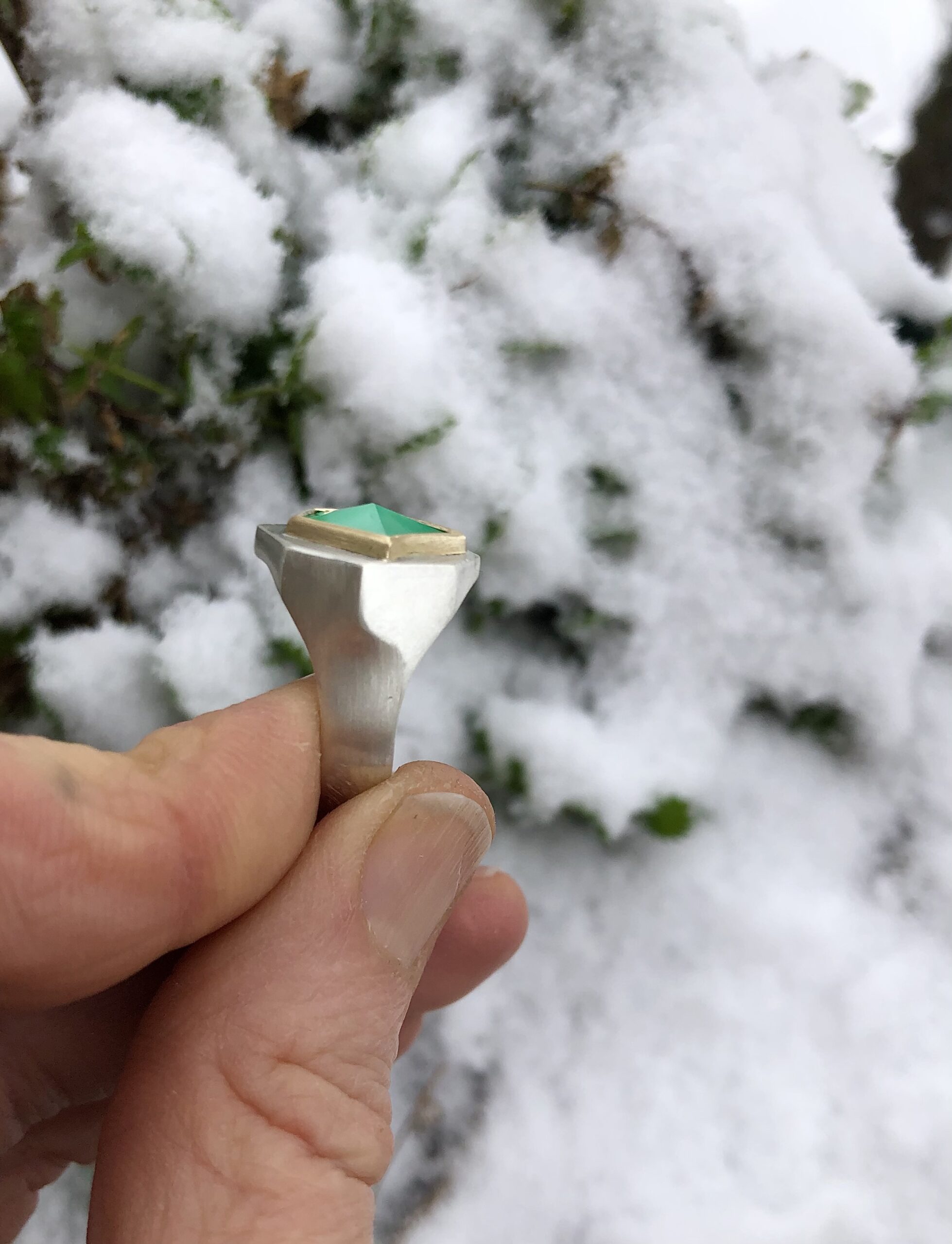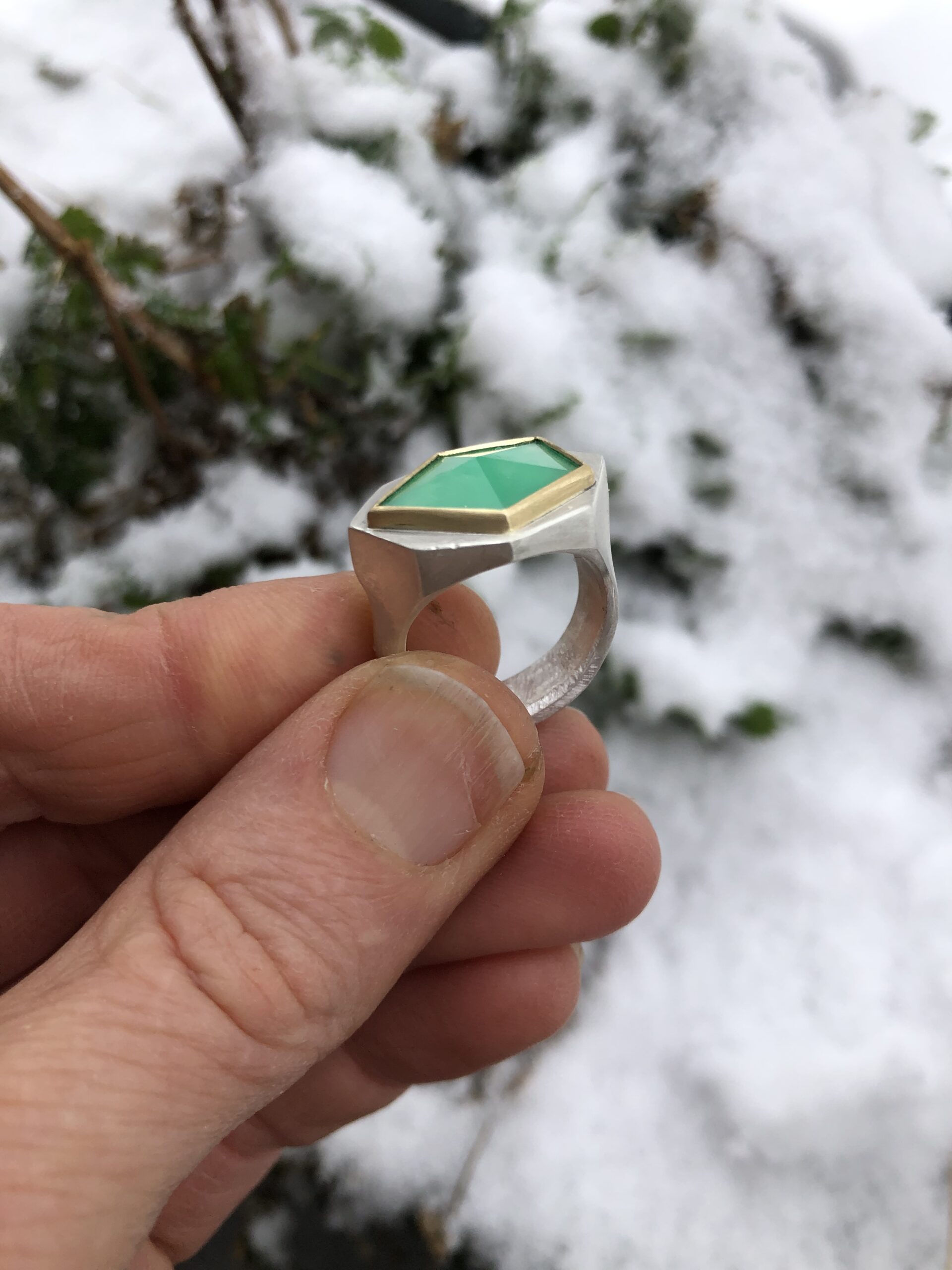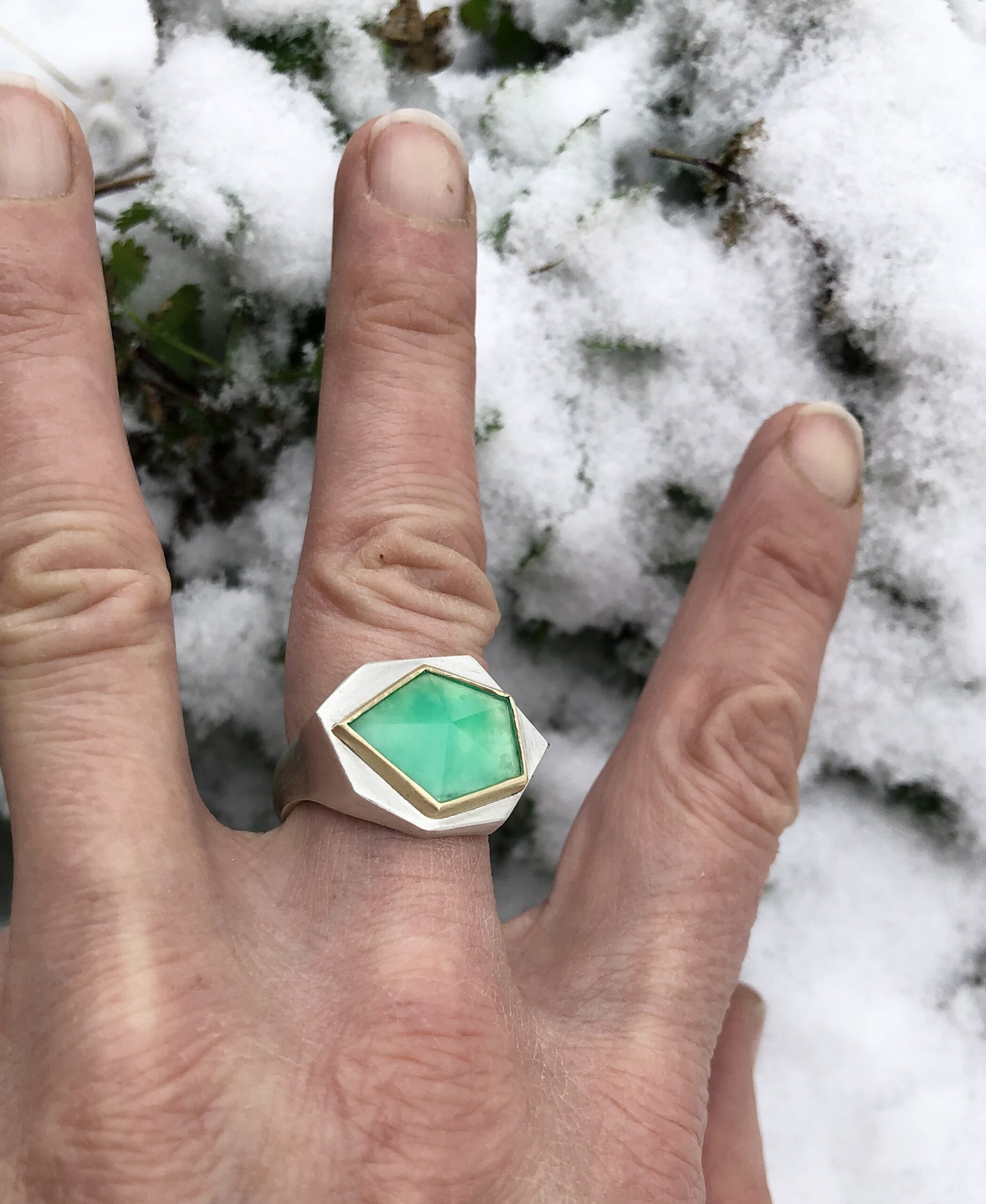 Ring Silber, Fassung Gelbgold 750 18ct,Chrysopras facettiert